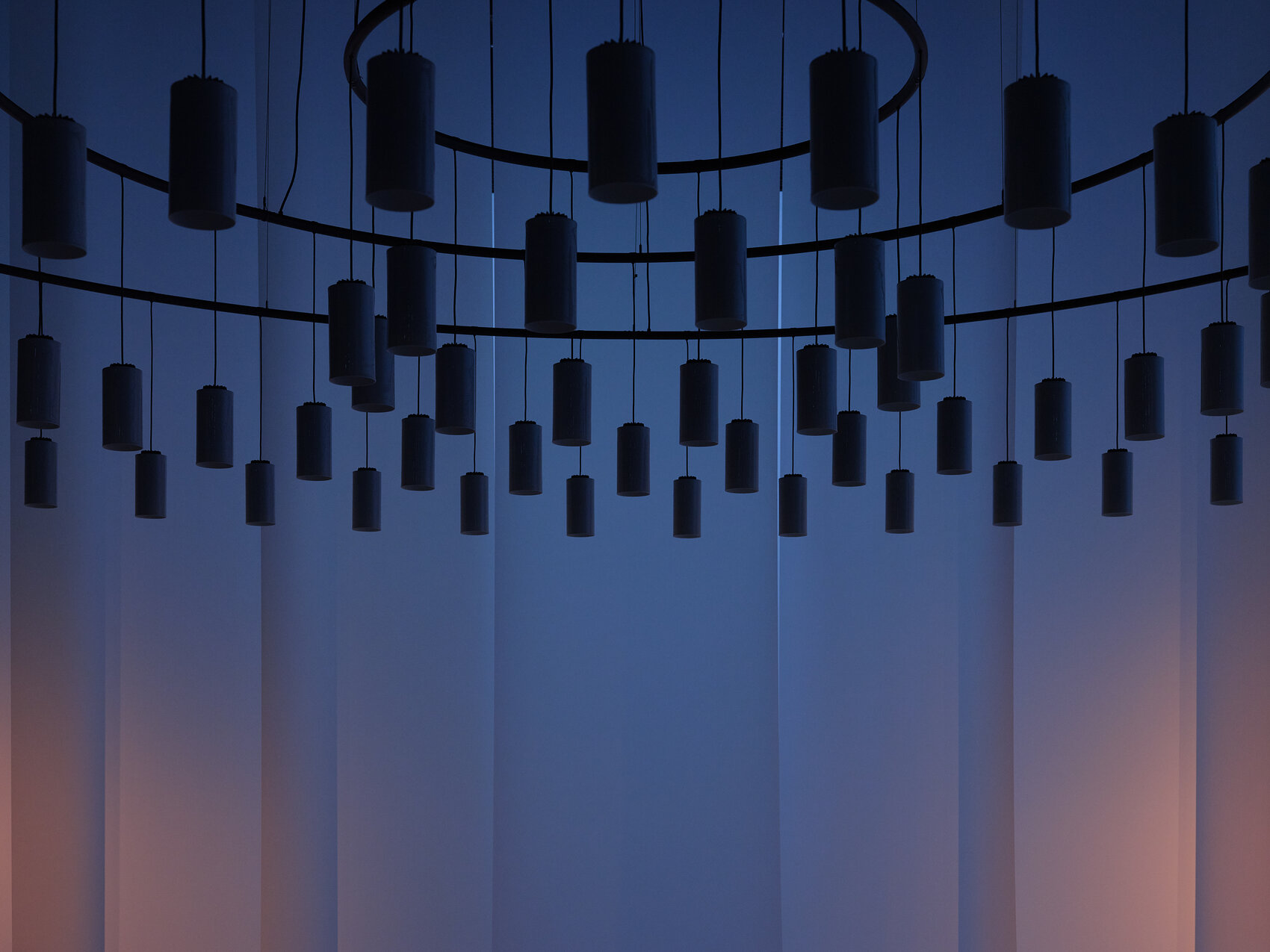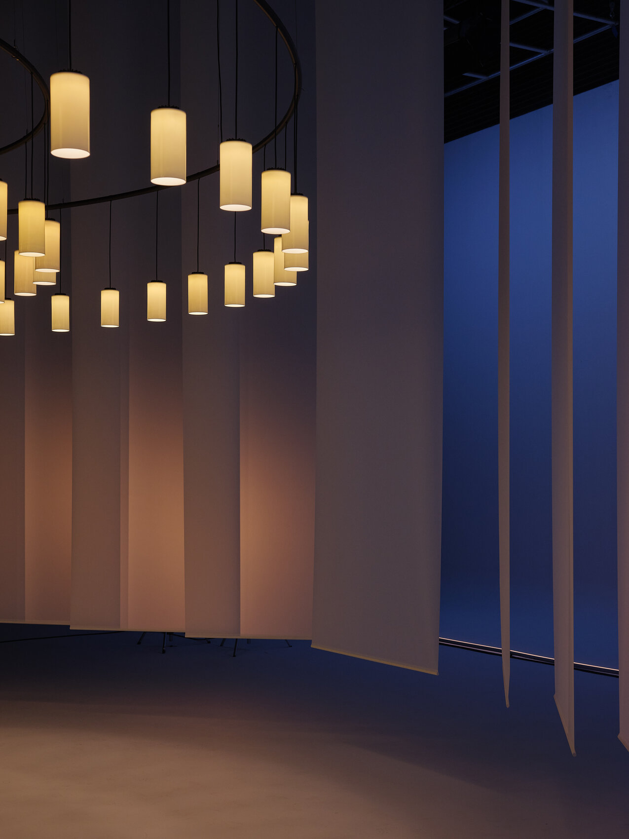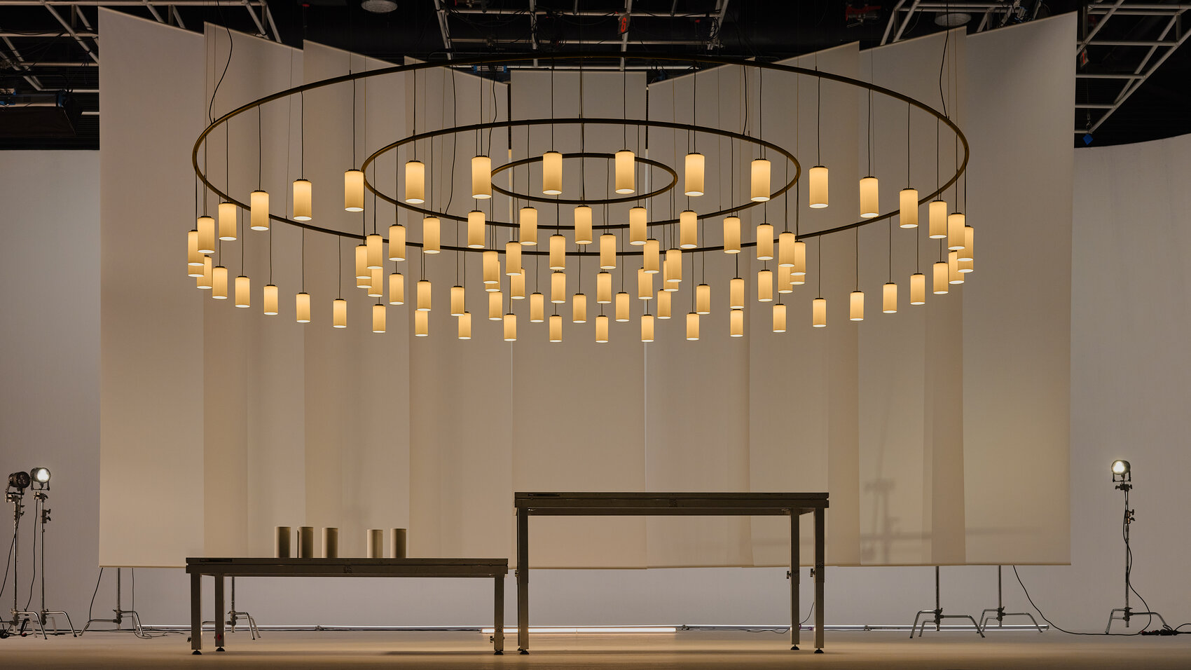 With combinable diameters, it reinterprets suspended rings of light through delicate compositions with presence, balance and solemnity.