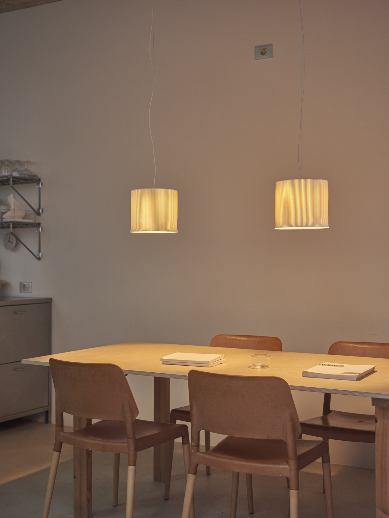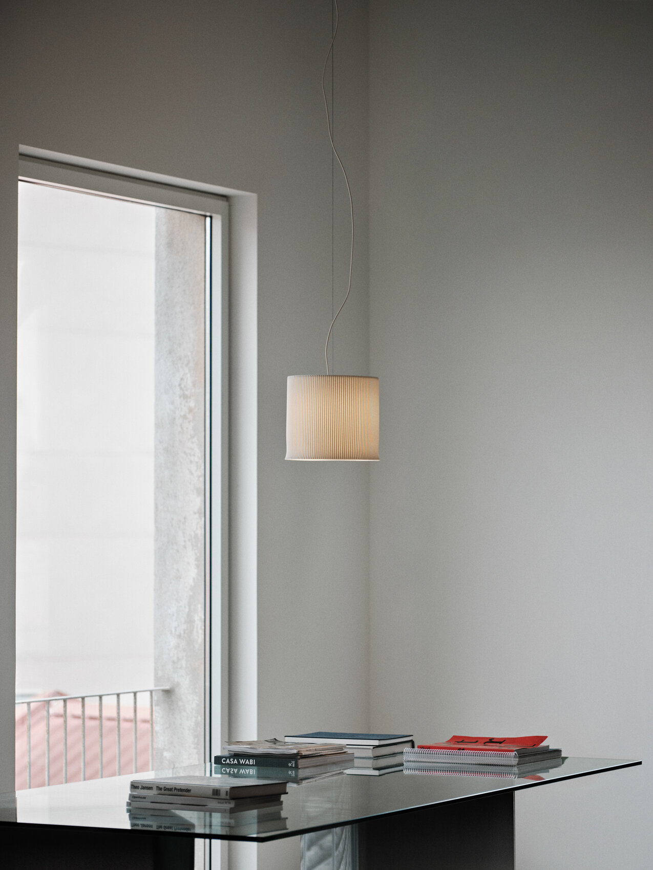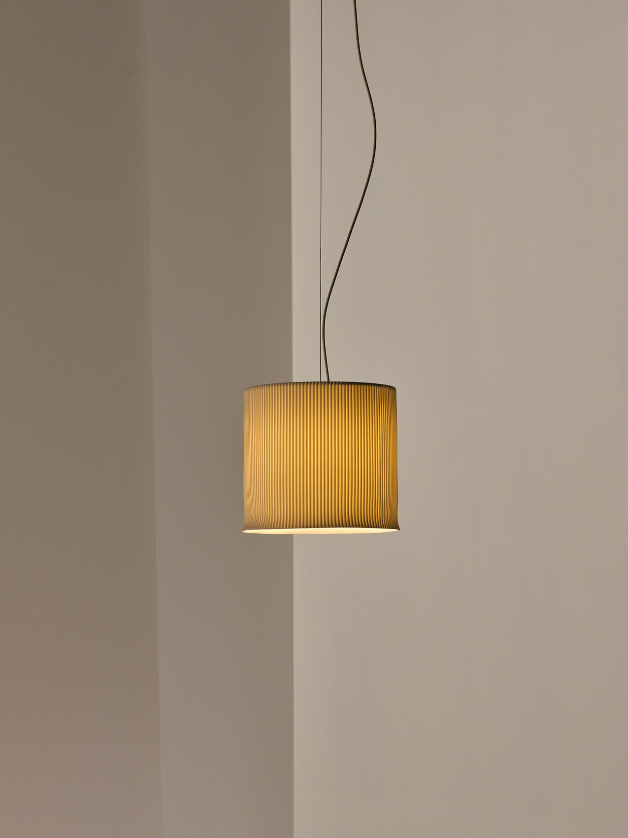 Cirio Pana reimagines the wax candle in porcelain, with broad focused light and a grooved texture that evokes the soft depth of corduroy fabric.