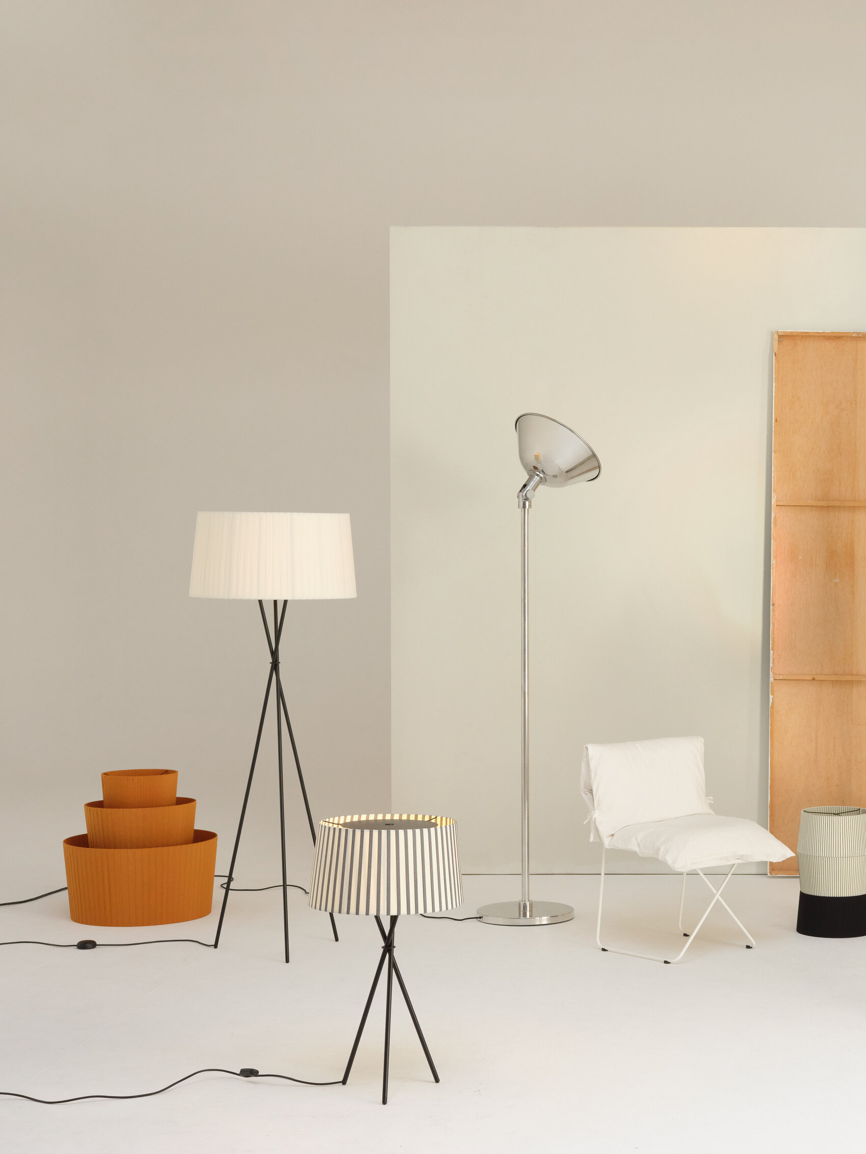 Trípode lives up to its name: three black metal rods support a wide, fluted shade with strong presence.