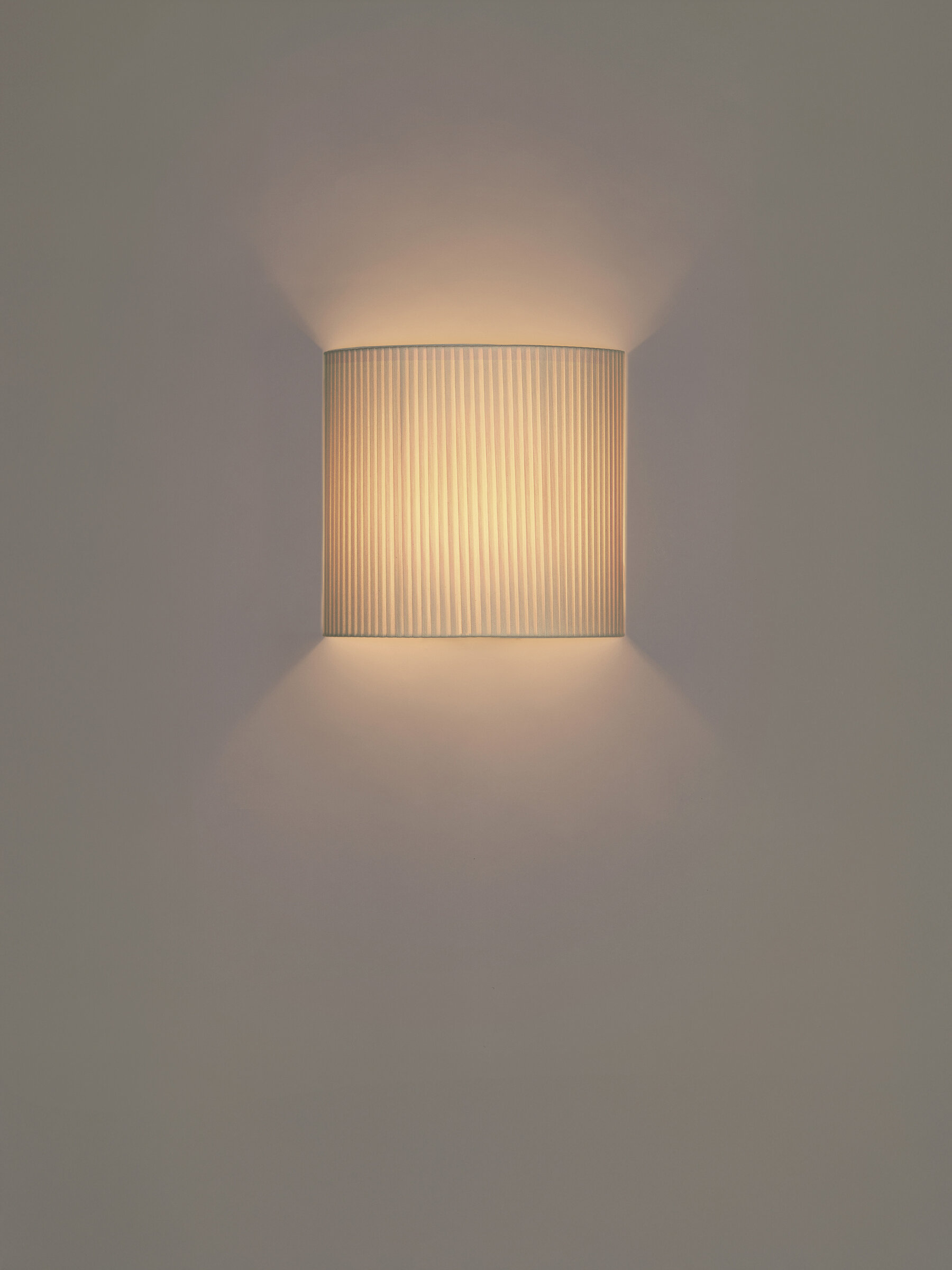 This minimalist wall lamp humanises neutral spaces with its colourful and functional sobriety. The shade is fondly hand-ribboned, piece by piece. Switched on, it provides a characteristic warm light, rich in nuances, and switched off, it is a small, volumetric sculpture that invites immediate use. The shape of its shade conceals the light source from sideways view.