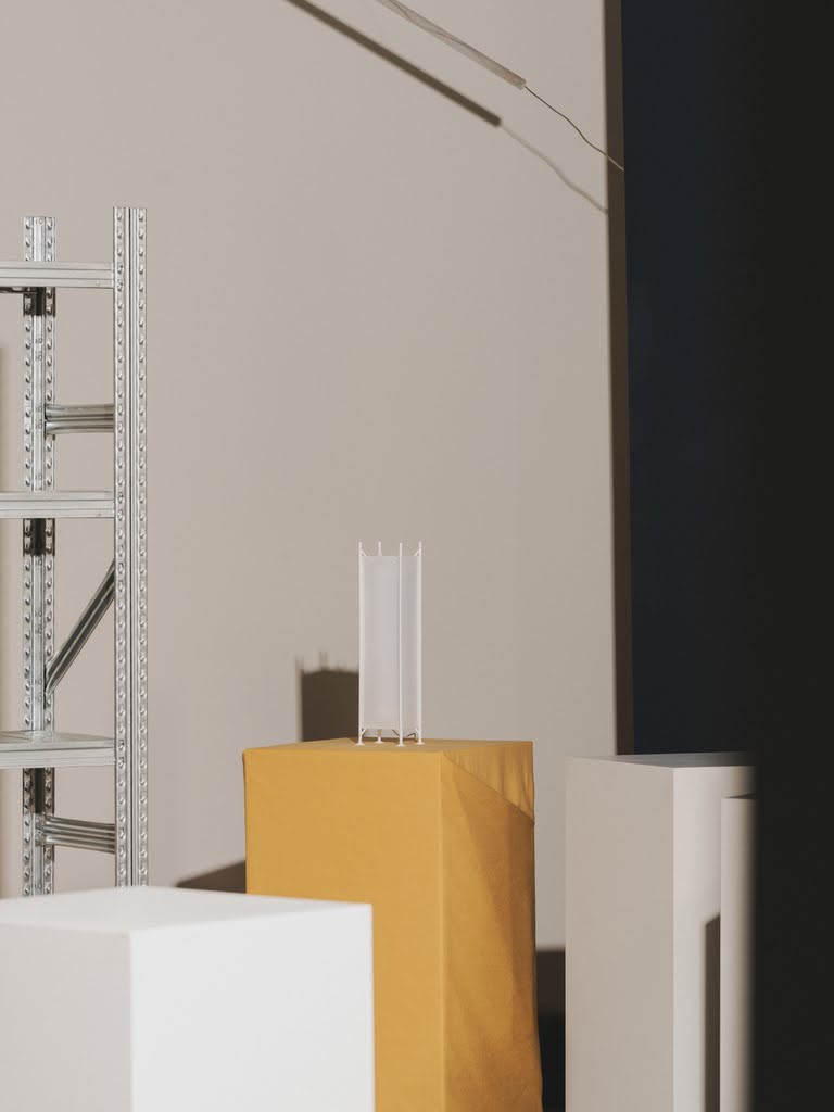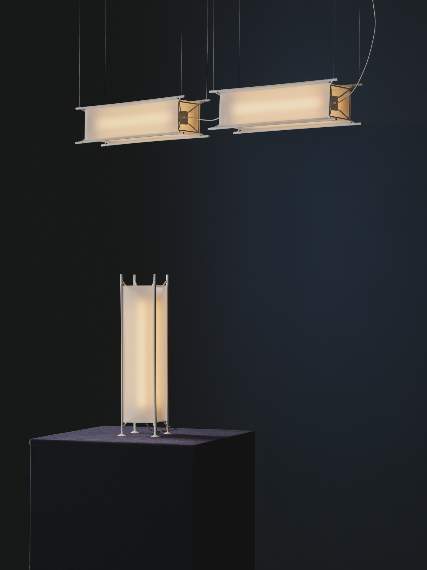 Tensión, transparencia, equilibrio. Un armazón despliega una creativa pantalla prismática de sección cuadrada, confeccionada con filtro de fotografía. La resistencia del esqueleto transforma lo plano en volumen, dando forma a un cuerpo. A través de cuatro bolsillos, rematados con costuras visibles, viajan varillas transversales que marcan el ritmo de la superficie. La piel traslúcida cualifica la luz.