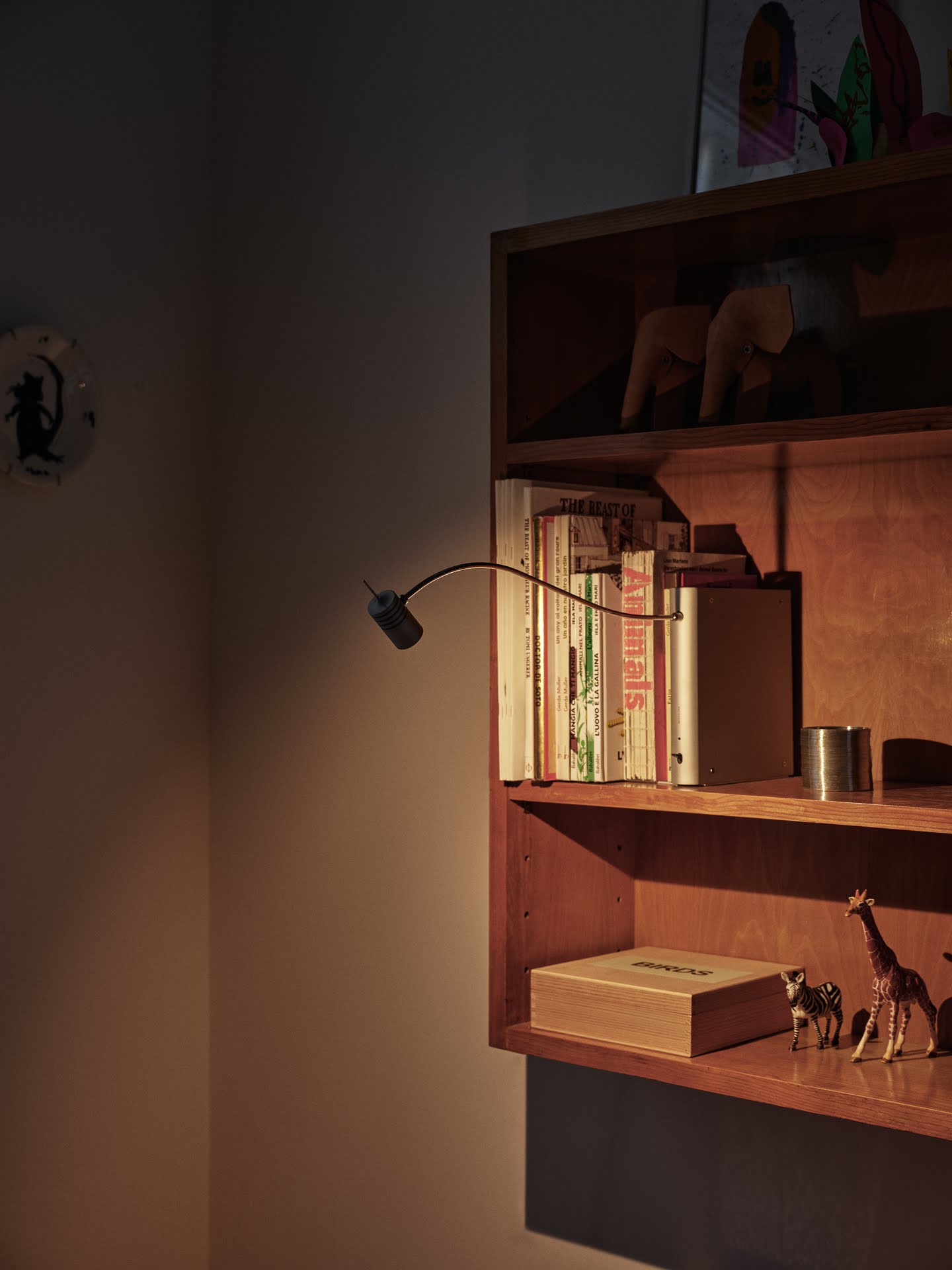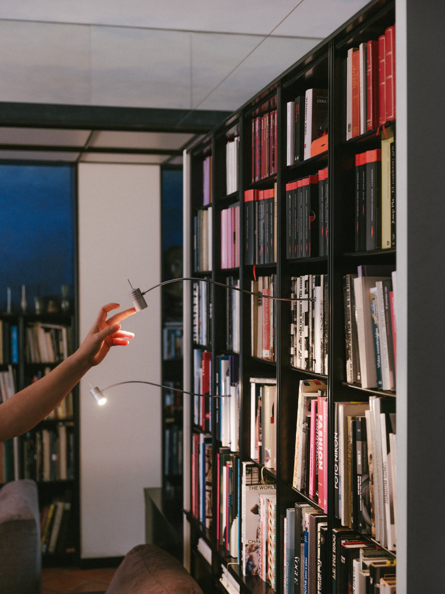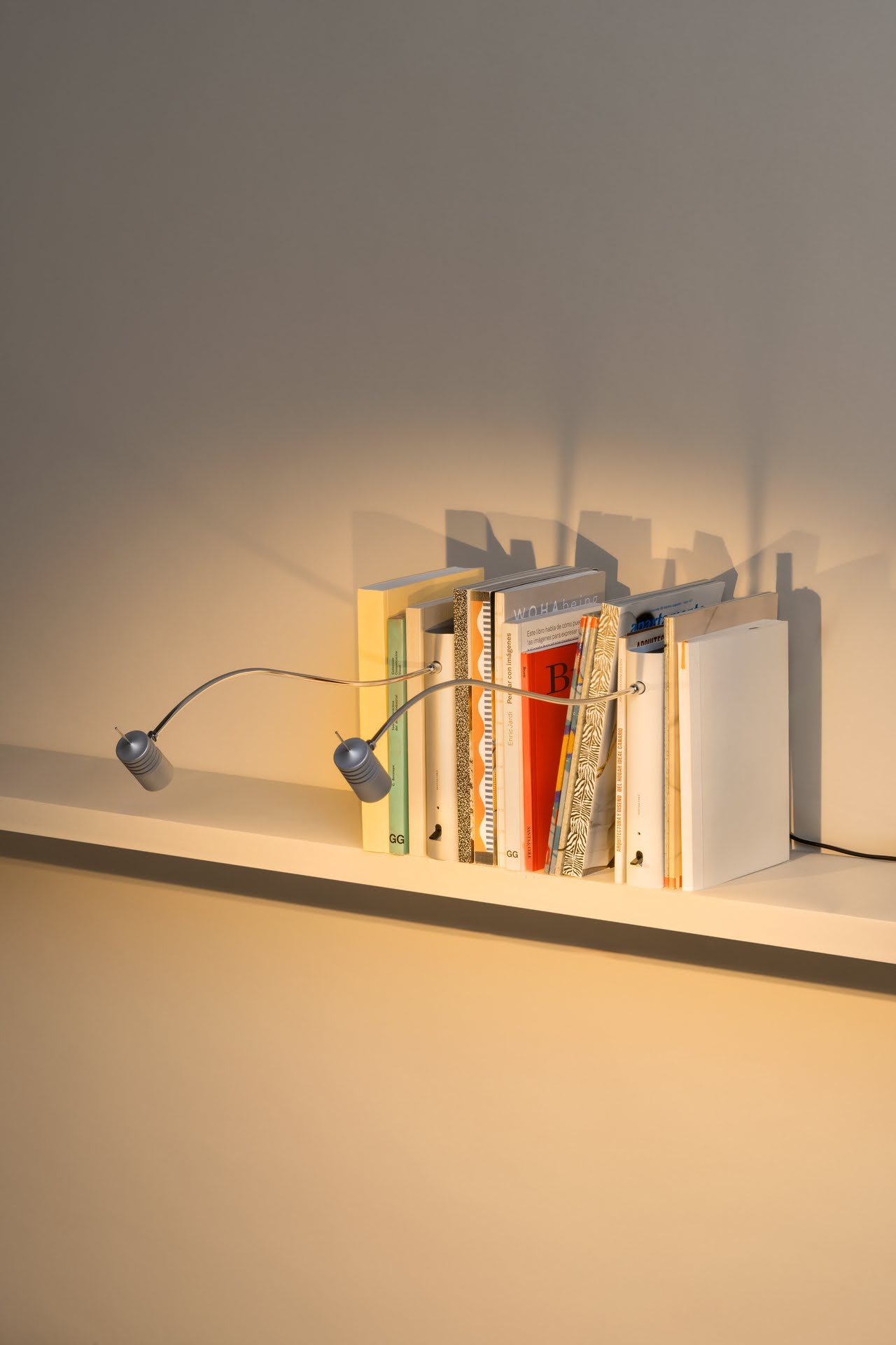 Bib Luz tiene un cuerpo metálico con forma de libro, en blanco o gris aluminio, para ser colocada en estanterías, entre verdaderos libros. De la parte superior del lomo se avanza un fino brazo con un punto de luz orientable en su extremo que permite resaltar todo rincón. Además, se pueden interconectar múltiples unidades en serie con un solo enchufe a la pared y crear composiciones a distintos niveles. Siempre con excelente resultado, no deslumbrante, para quién busca entre los libros.