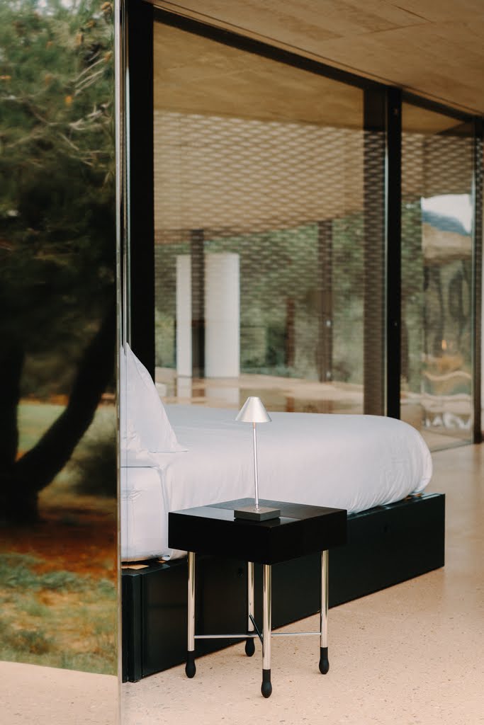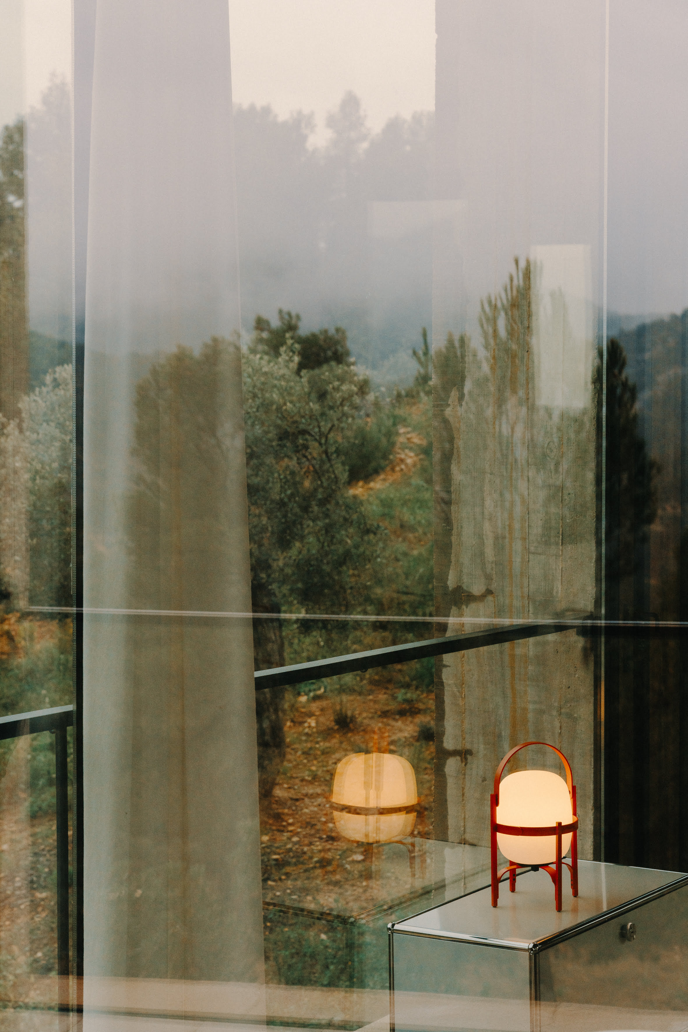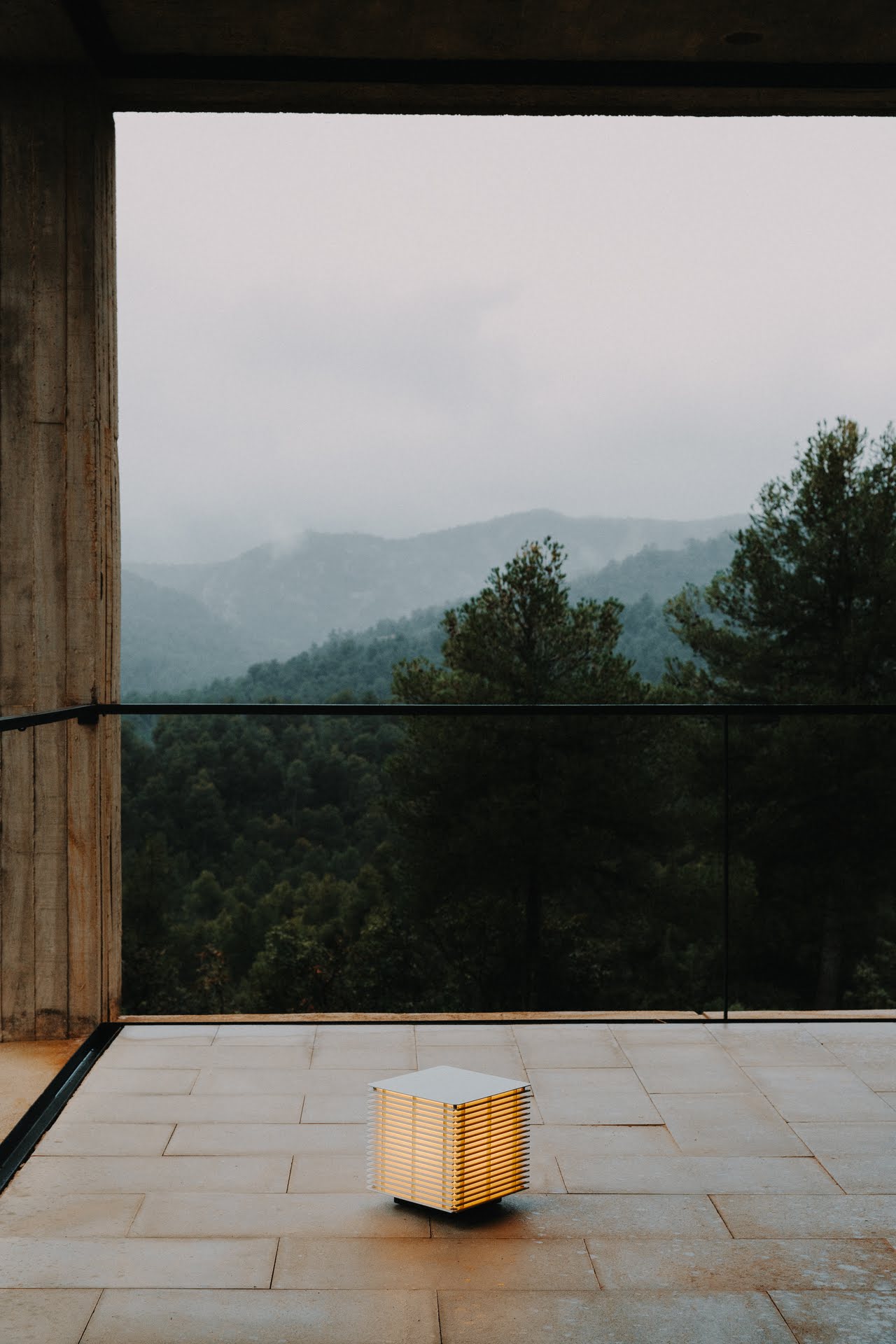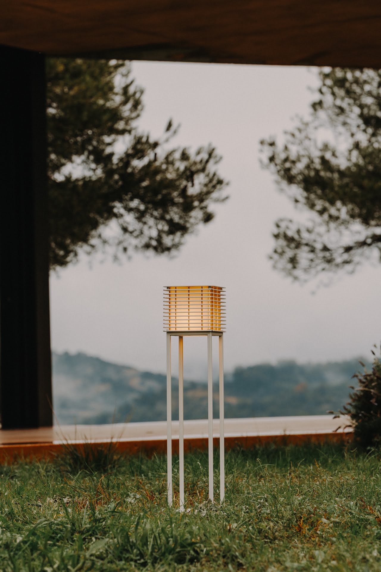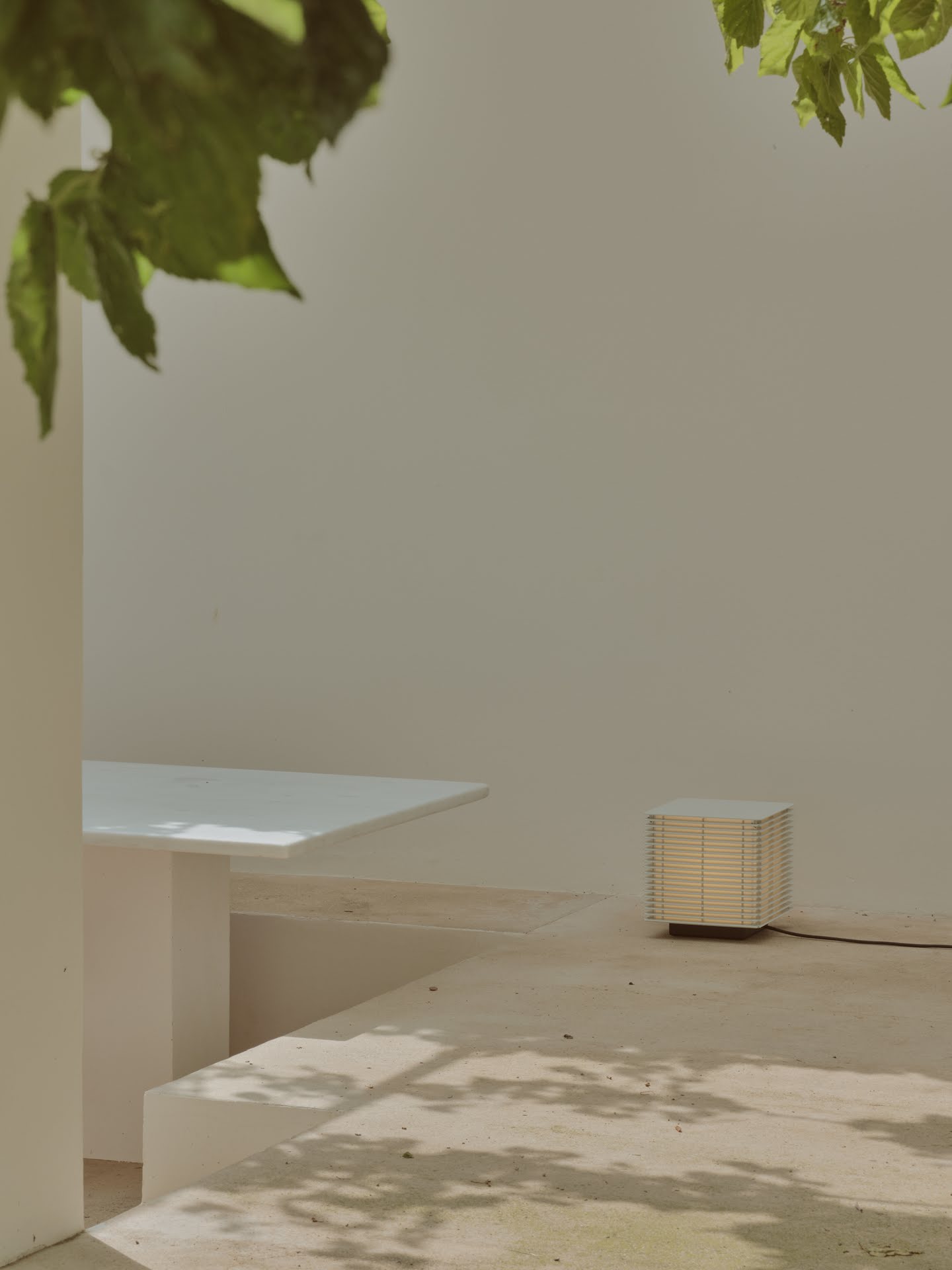 Esta lámpara de exterior establece un diálogo entre arquitectura y jardín, integrándose con fluidez en su circunstancia. Es un objeto racional y pulcro, donde la estructura no encierra sino que filtra el flujo luminoso a través de unas lamas dispuestas en forma de cubo. El resultado es una iluminación suave y rasante, que genera una atmósfera de calma y equilibrio entre el espacio exterior habitado y la naturaleza abierta.