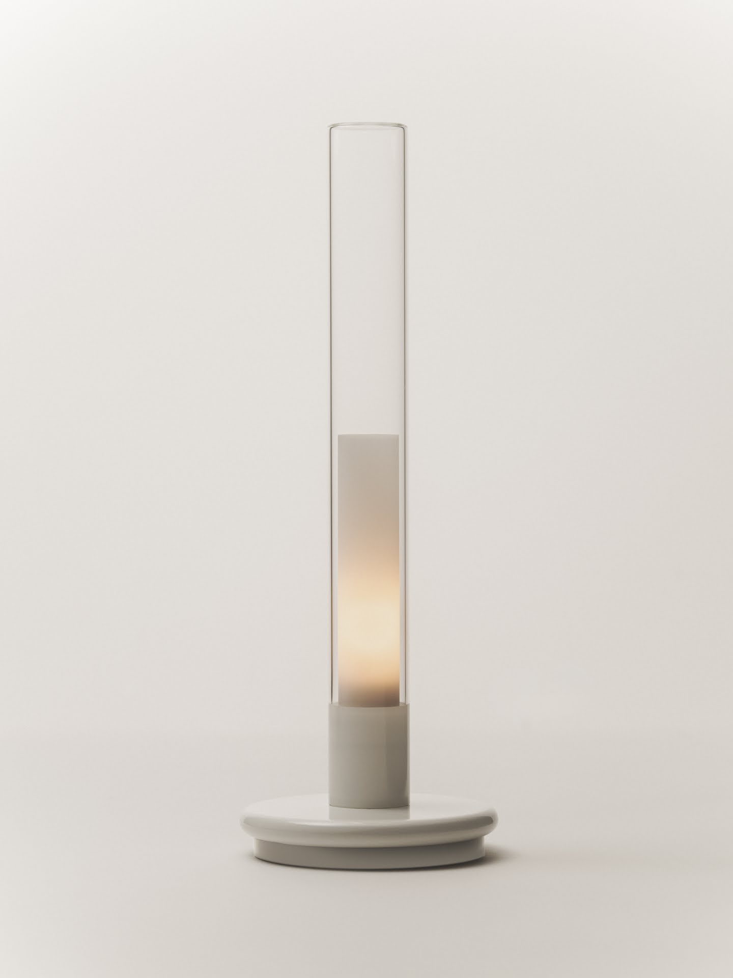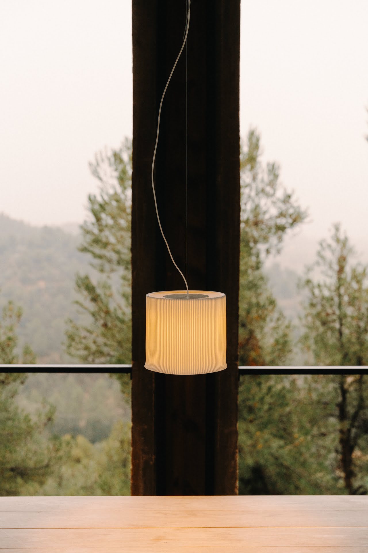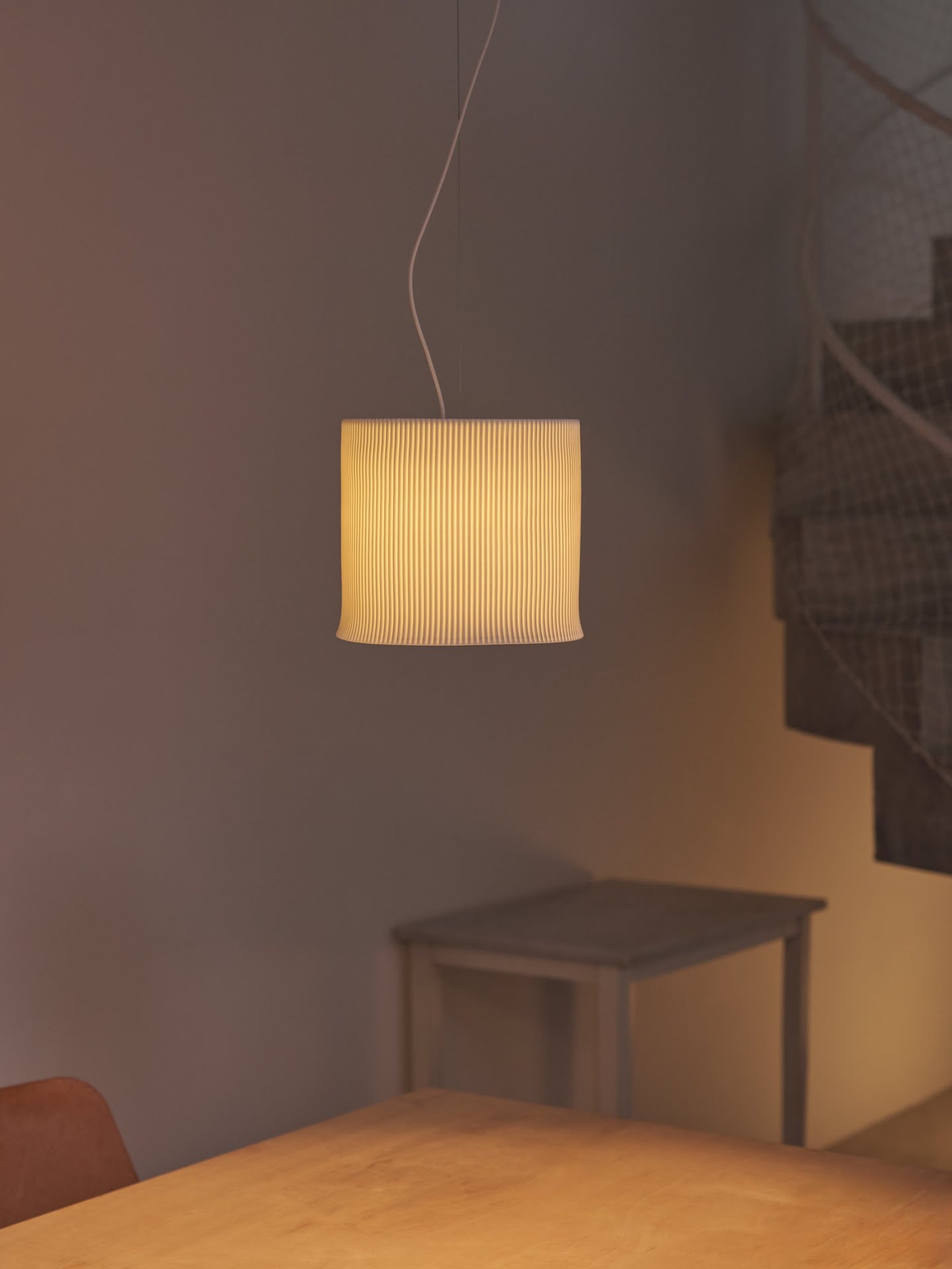 Cirio Pana reinterpreta la gran vela de cera, histórico objeto de rito, a través de la porcelana. Su disco luminoso, mucho más potente que el de su hermana menor, se viste con una pantalla de igual altura que anchura produciendo una luz focal, amplia y envolvente. Con matices únicos en cada pieza, la textura acanalada evoca la suavidad y relieve del tejido de pana, con un trazo sutil de finas estrías verticales.