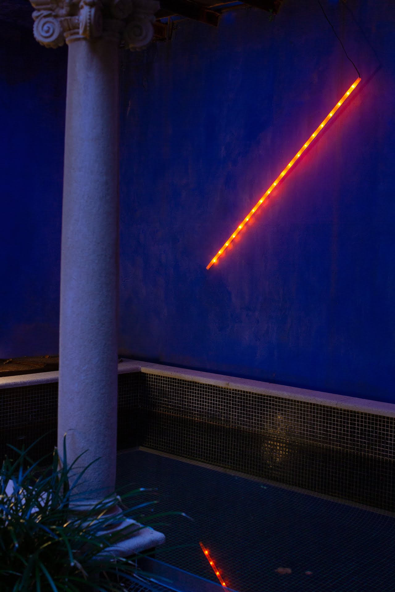 Constituida por un tubo translúcido producida en dos versiones de tamaño, la ya habitual de dos metros y la recientemente reincorporada al catálogo de un metro, la superficie suavemente matizada apantalla una serie de bombillitas de neón en su interior que producen un consumo total irrelevante y tienen una larguísima vida útil, al punto que se entrega sin interruptor para que se deje siempre encendida. Con opción de suspenderla por un hilo fino y resistente, produce la ilusión de estar flotando en el espacio. Y múltiples son sus usos en dormitorios o salones, como piloto permanente en pasillos, escaleras o porches, e incluso como amable custodia de los sueños infantiles.