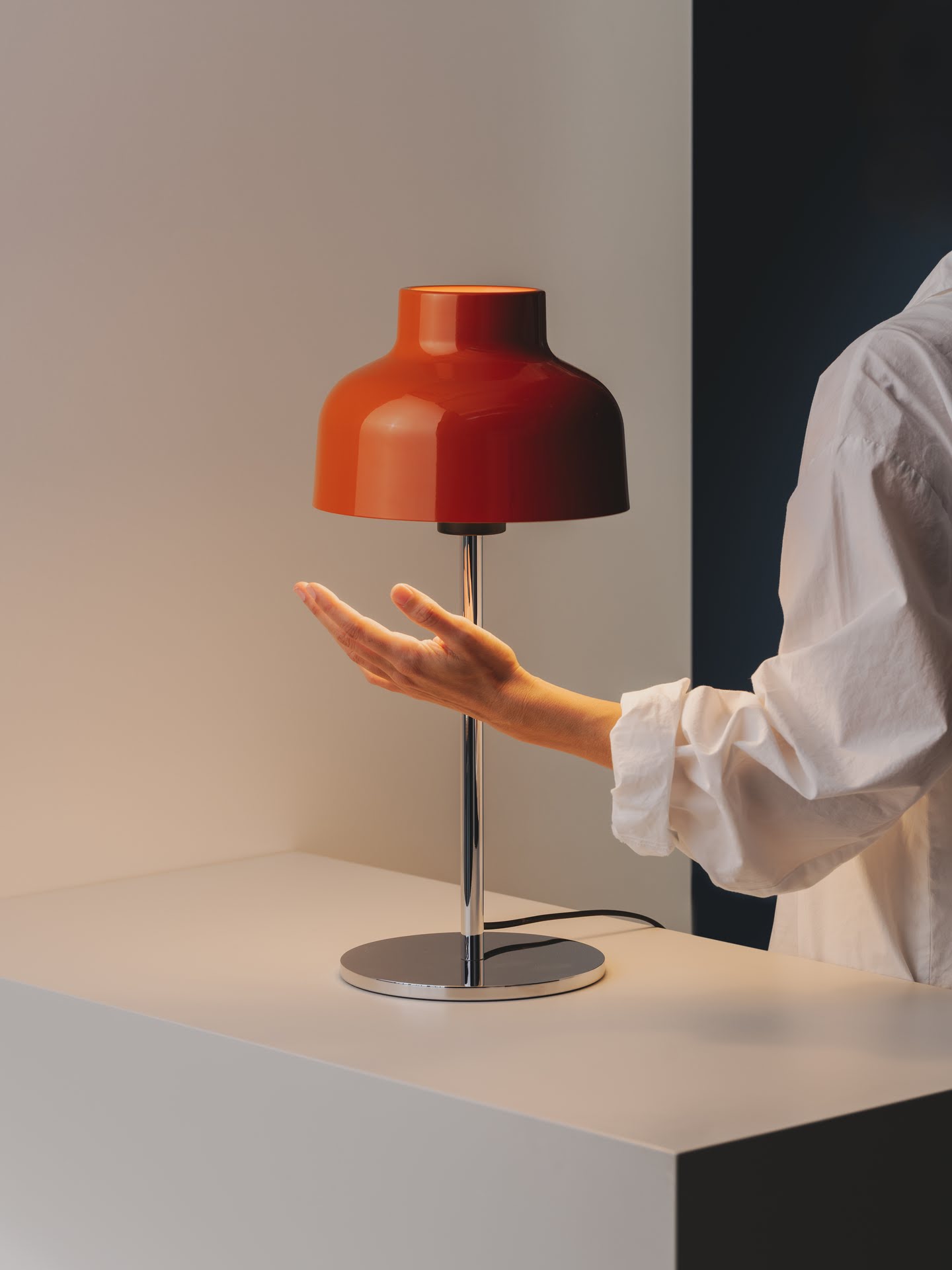 Fiel a sus principios, esta versión sintetiza los elementos de la lámpara en metal cromado, dando protagonismo a su voluptuosa y sensual pantalla, disponible en 10 acabados. Proyecta un preciso cono de luz sobre la superficie mientras desprende un resplandor a través de su apertura superior matizada por un filtro.