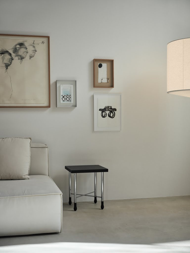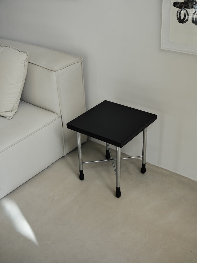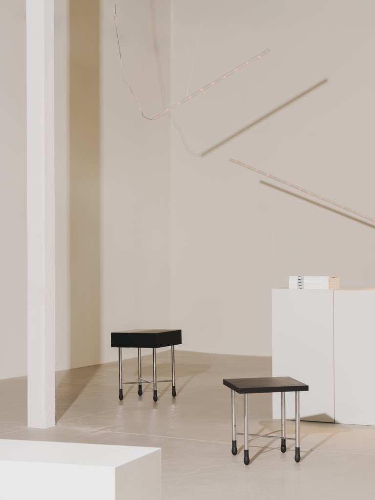 La Mesita GO fusiona funcionalidad y singularidad. Sus patas cromadas, rematadas con generosos tacos cuya forma remite a la cabeza de las cerillas, elevan aparentemente sin esfuerzo el sobre de roble teñido en negro.