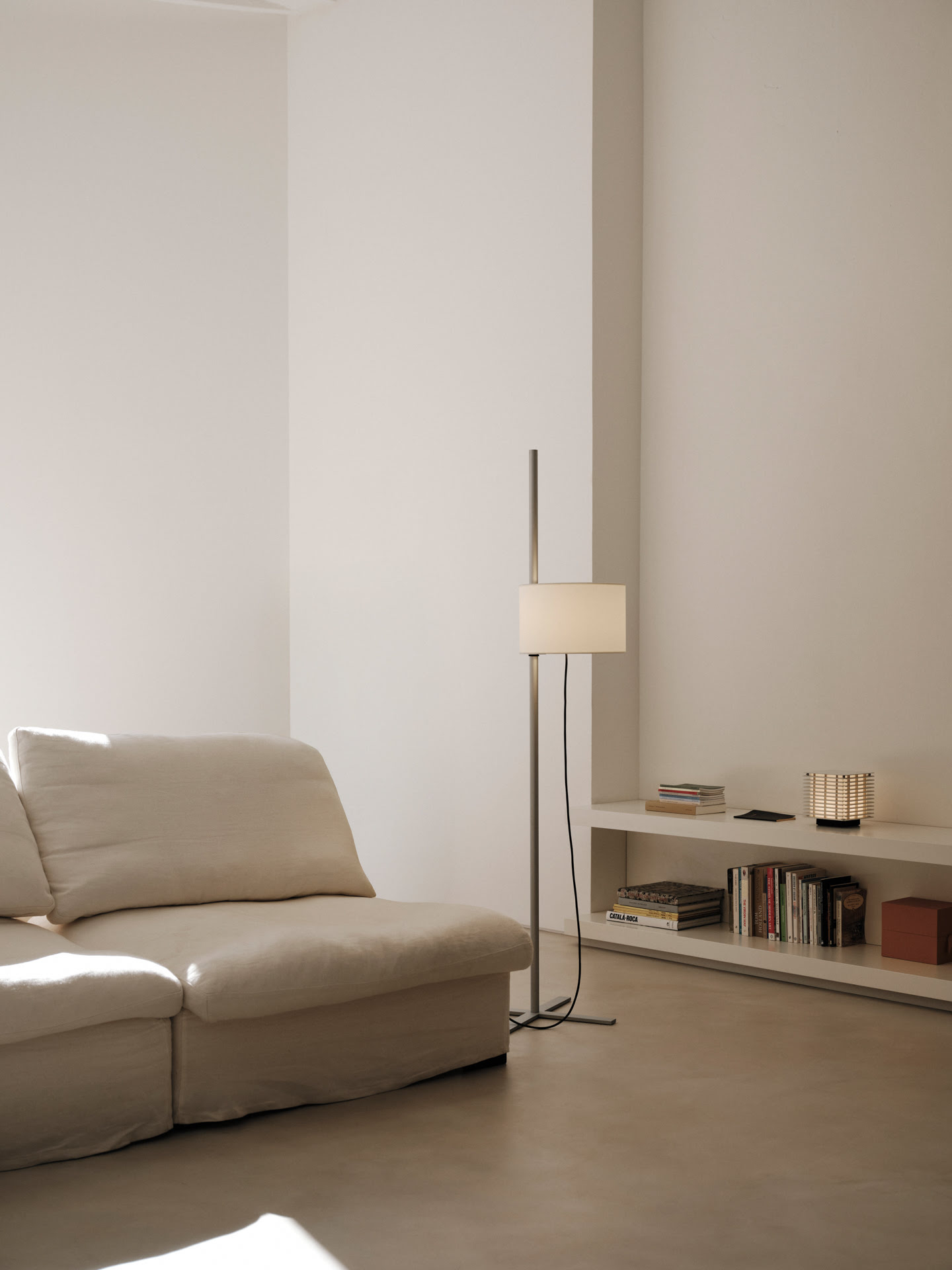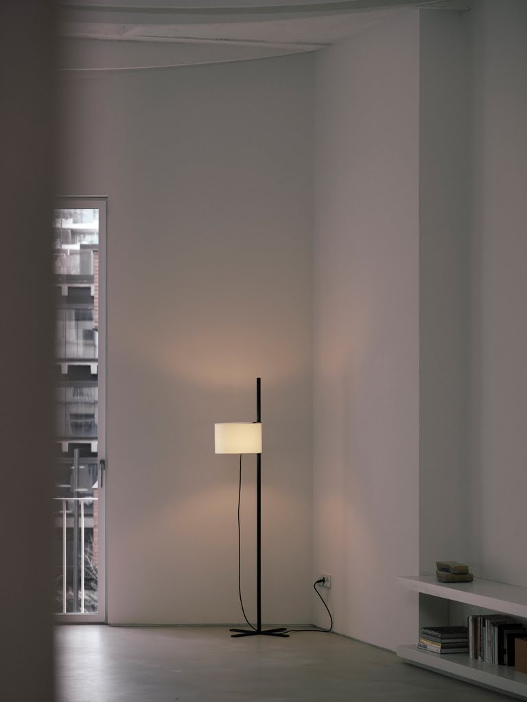 En una demostración de serenidad formal y eficacia funcional, Miguel Milá consiguió separar los tres elementos esenciales de toda lámpara: su estructura, sus componentes eléctricos y su pantalla. Una base en forma de aspa, una barra maciza como mástil y una liviana estructura que sostiene el portalámparas. La pantalla gira en torno al eje y ajusta su altura gracias a una simple goma, como una vela que se iza en su mástil. Siempre con su distintivo interruptor: basta con un suave tirón del cable. De aspecto ligero y de construcción robusta, se traslada fácilmente.