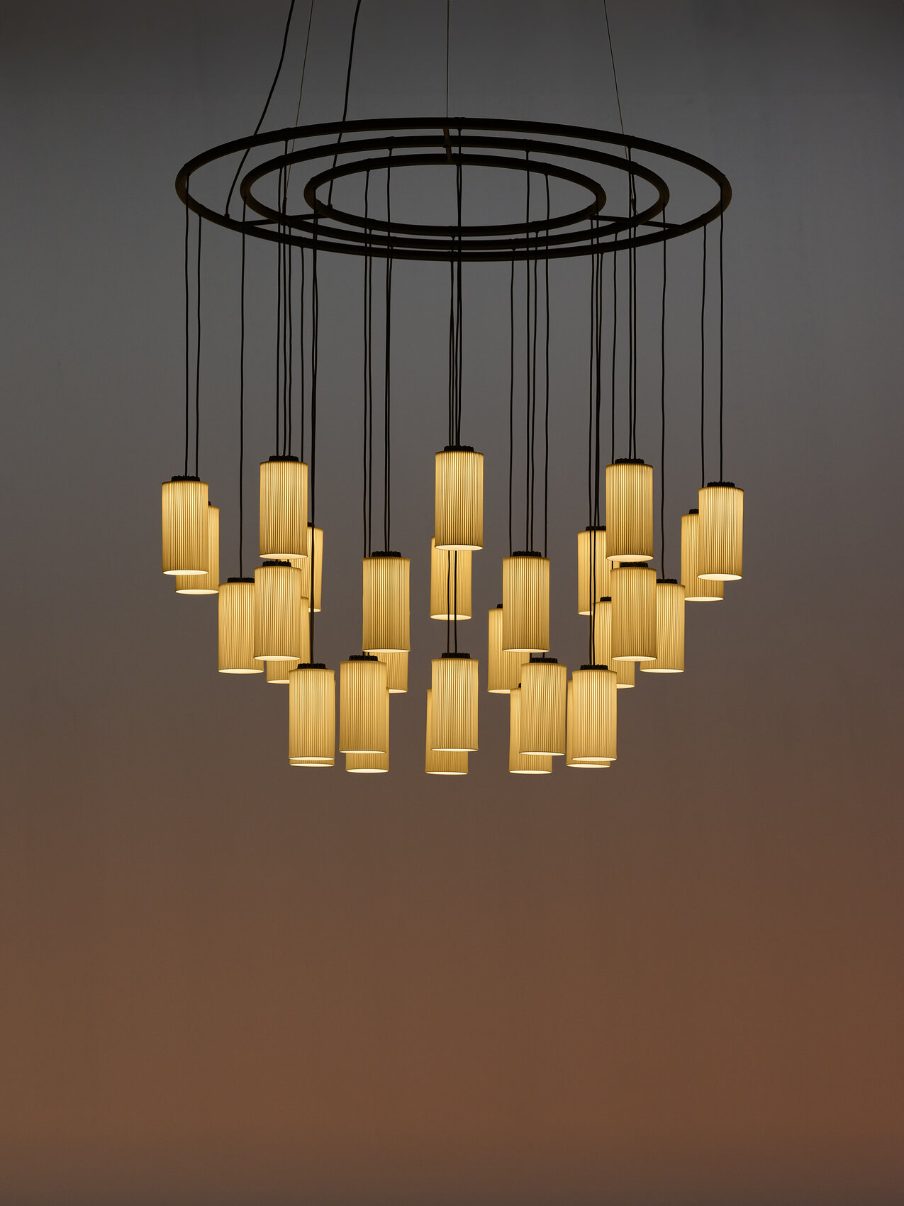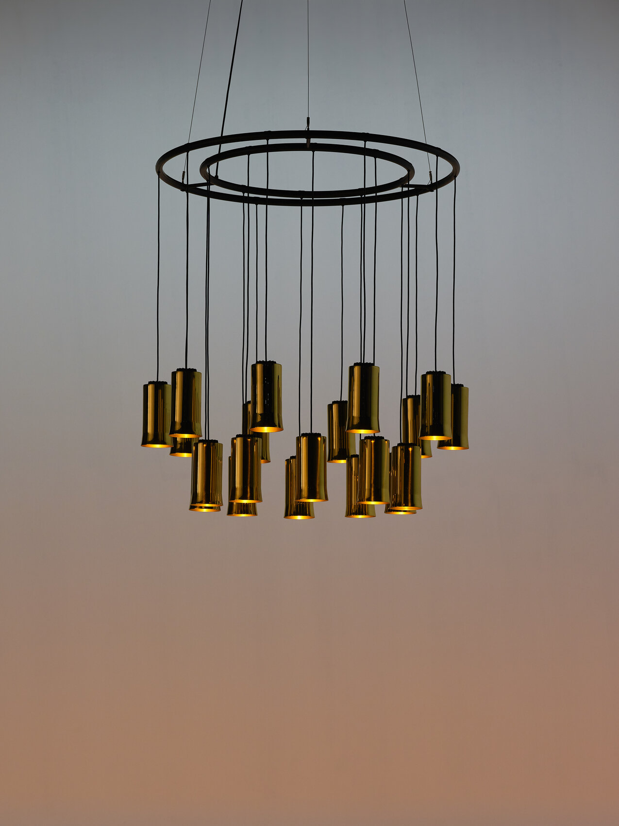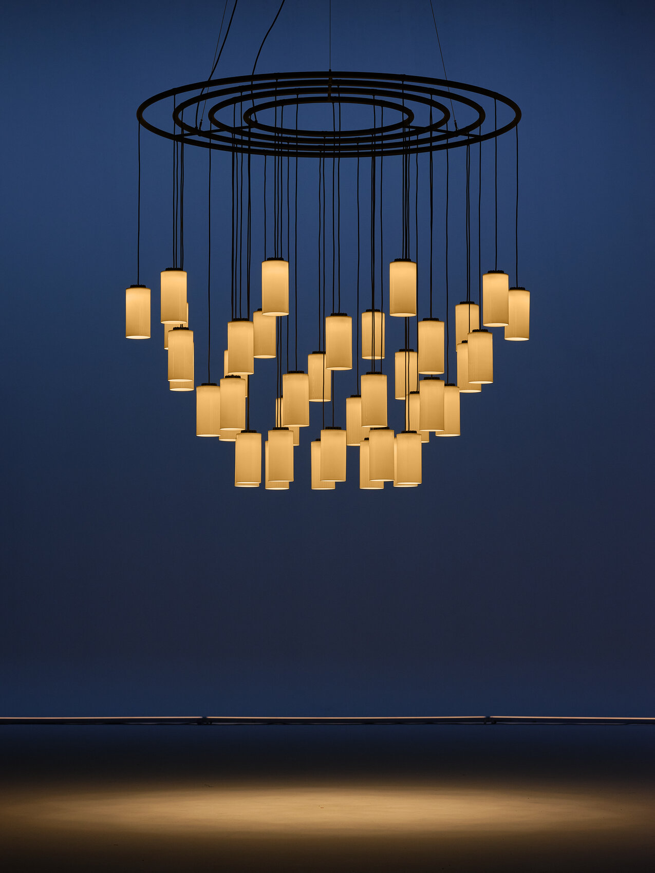 Relectura del chandelier clásico, esta vez sin ornamentos: la riqueza visual proviene de la acumulación de luz en distintas alturas y densidades.