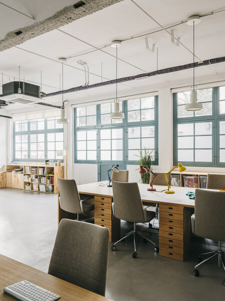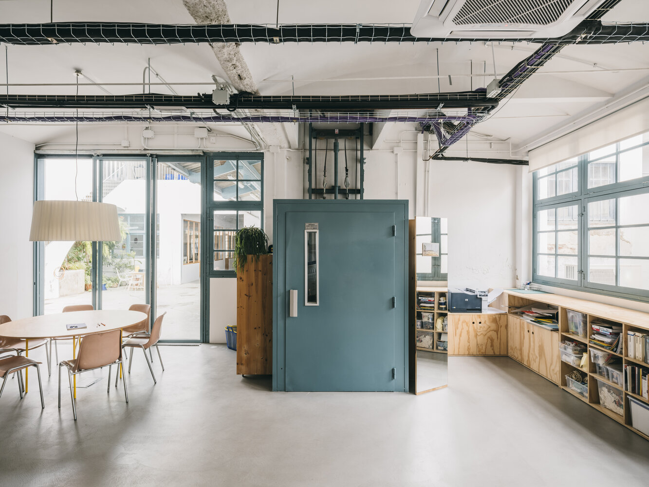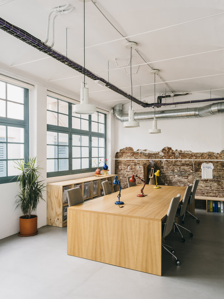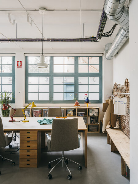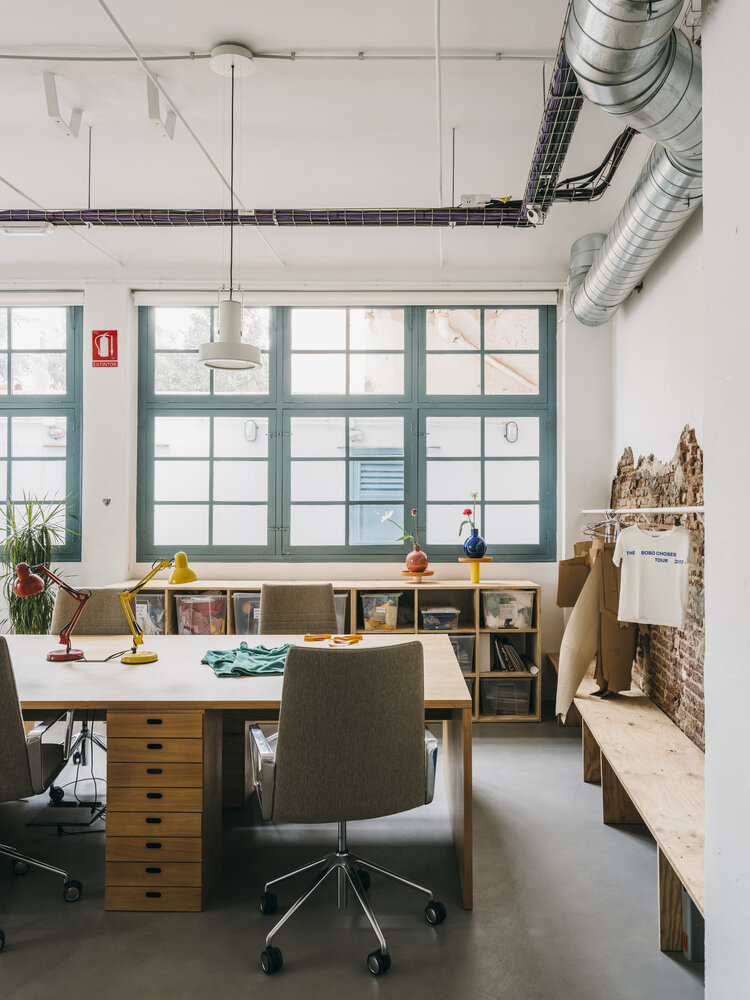 La rehabilitación consistió en convertir el espacio industrial de 600m2 en un colorido estudio compuesto por oficinas, showroom, sala de reuniones, set fotográfico y comedor. Un multifuncional y confortable espacio conectado por ventanales de vidrio, donde desarrollar el universo creativo de la marca.
