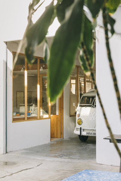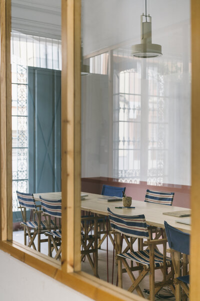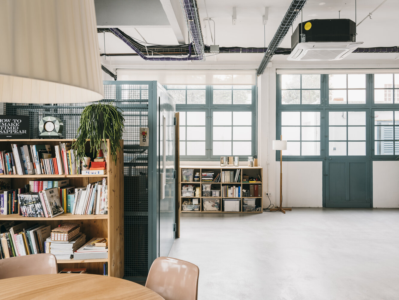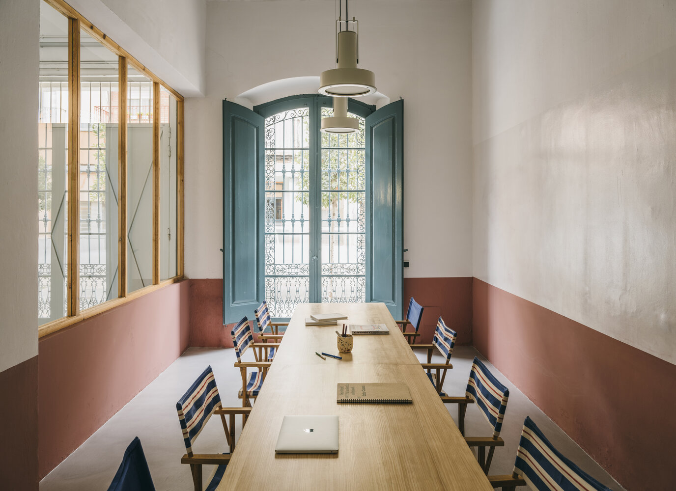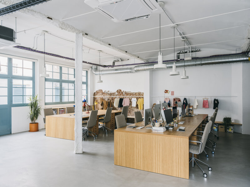La rehabilitación consistió en convertir el espacio industrial de 600m2 en un colorido estudio compuesto por oficinas, showroom, sala de reuniones, set fotográfico y comedor. Un multifuncional y confortable espacio conectado por ventanales de vidrio, donde desarrollar el universo creativo de la marca.
