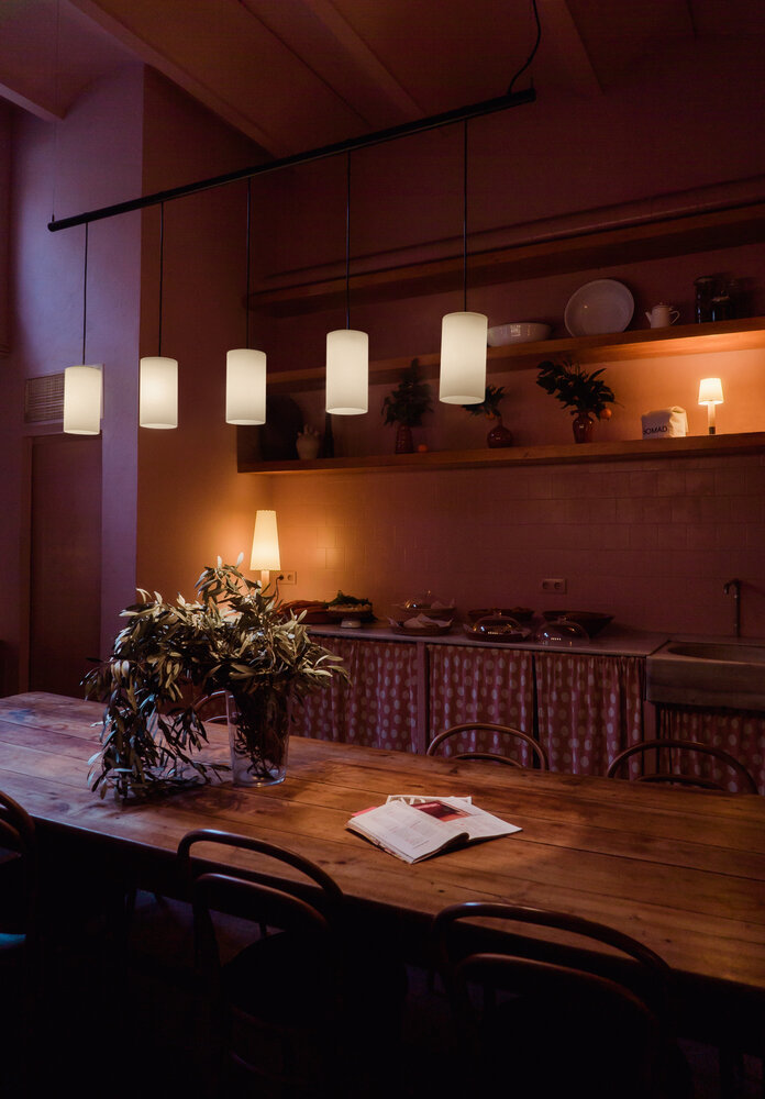 El restaurante, concebido como una masía urbana, es un refugio donde pausar el frenetismo de la ciudad y degustar una exquisita y generosa comida de confort. Bañado en un característico tono rosa, este proyecto diseñado por sus actuales propietarios integra el minimalismo con referencias campestres, tejiendo un ambiente bucólico, relajado.
